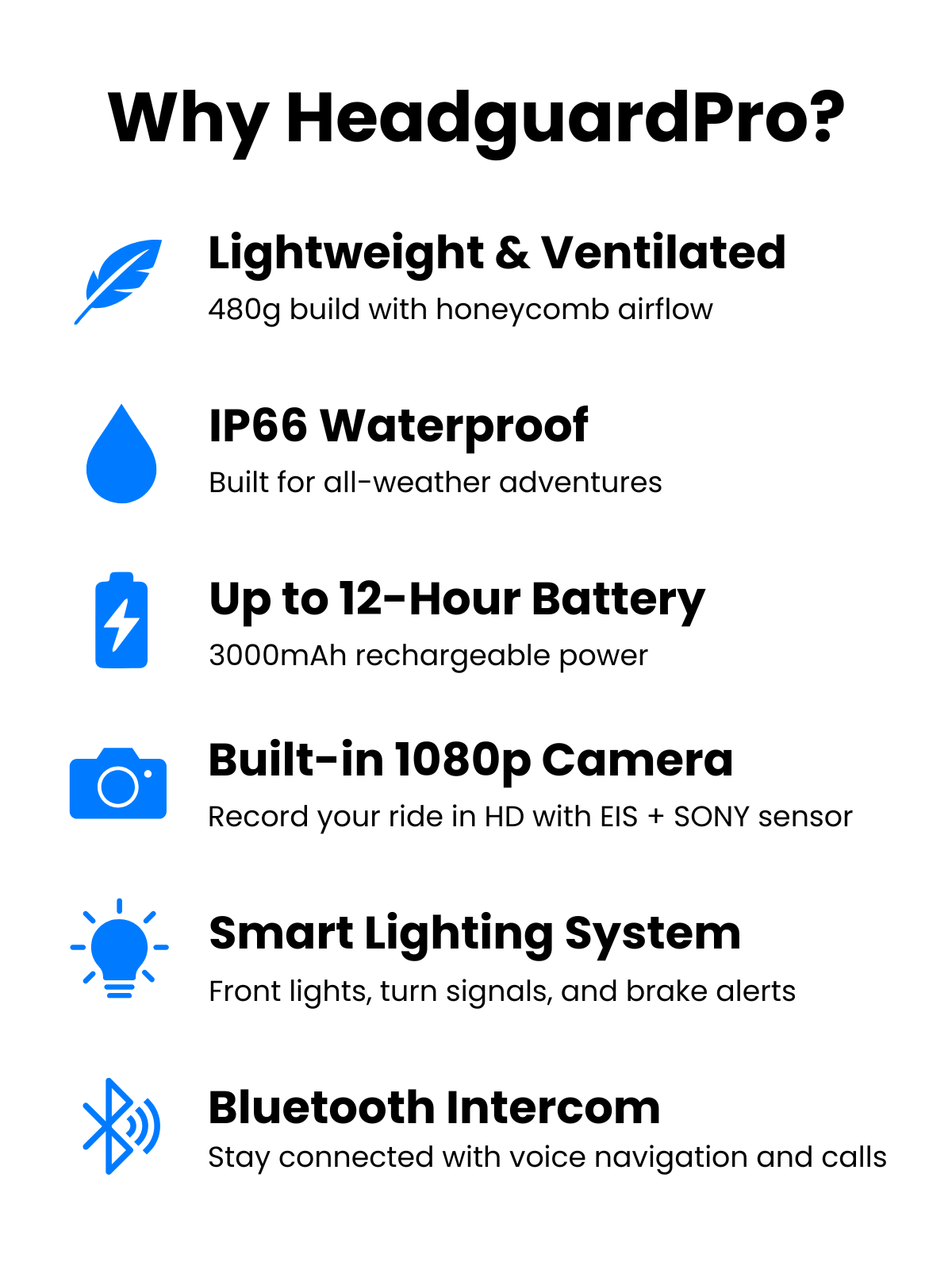 The HeadguardPro Smart Helmet combines advanced protection with integrated technology, purpose-built for delivery fleets, schools, and cycling programmes. Featuring a 1080p HD camera, Bluetooth voice intercom, integrated lighting system, and waterproof durability, it enhances rider safety, accountability, and connectivity in all conditions.